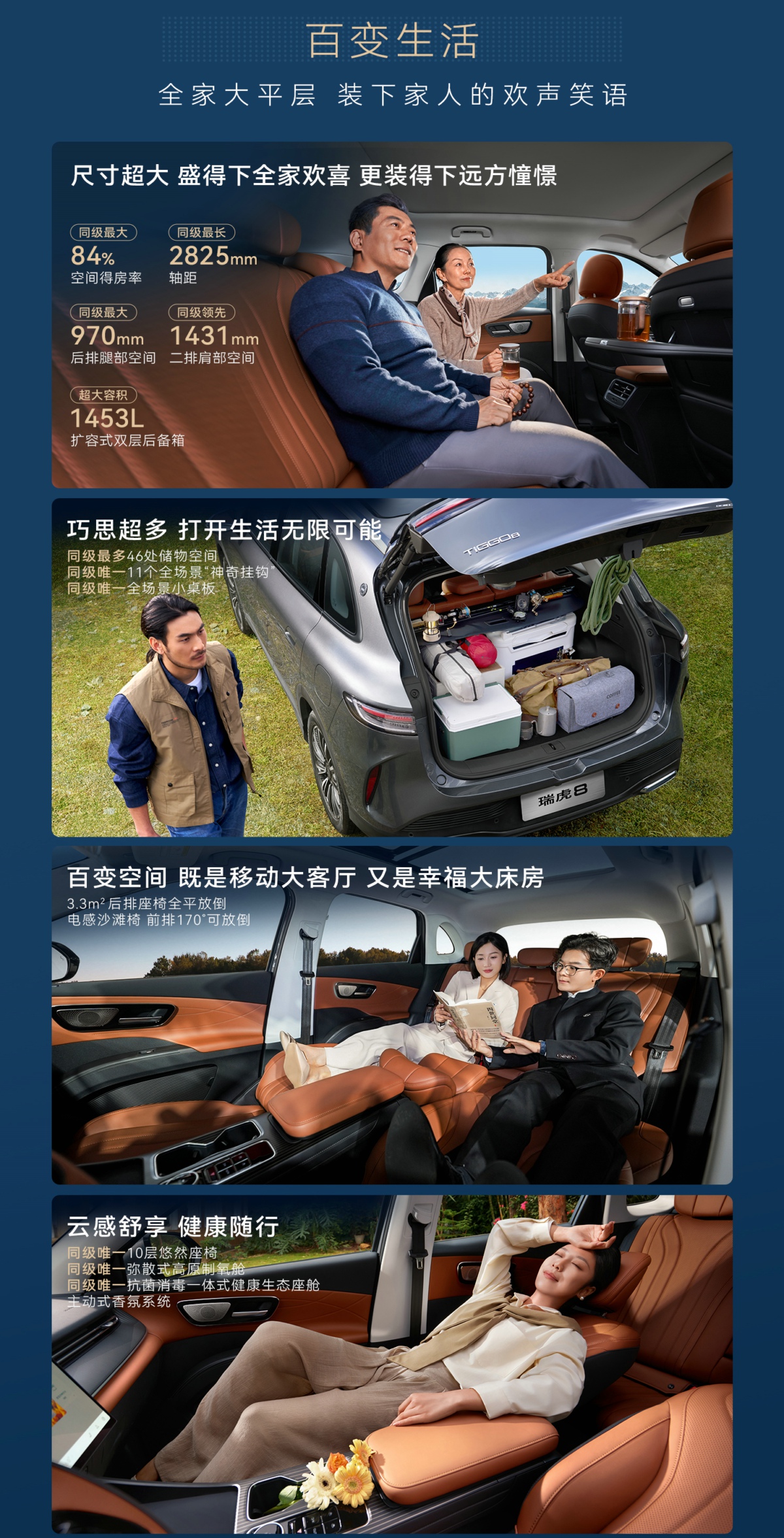 第五代瑞虎8以“全家大平层,移动大横厅”的创新空间理念,打造十万级空间天花板,助力家庭轻松开启百变生活。凭借同级最长2825mm轴距、最大84%空间得房率与970mm后排腿部空间,带来真正宽绰的大五座体验。全场景“神奇挂钩”、承重15kg的小桌板、电感沙滩椅模式等贴心配置,为家庭出行注入更多便利与乐趣。再配合10层悠然座椅与主动香氛系统,从实用到舒享,尽显百变格局与惬意氛围。