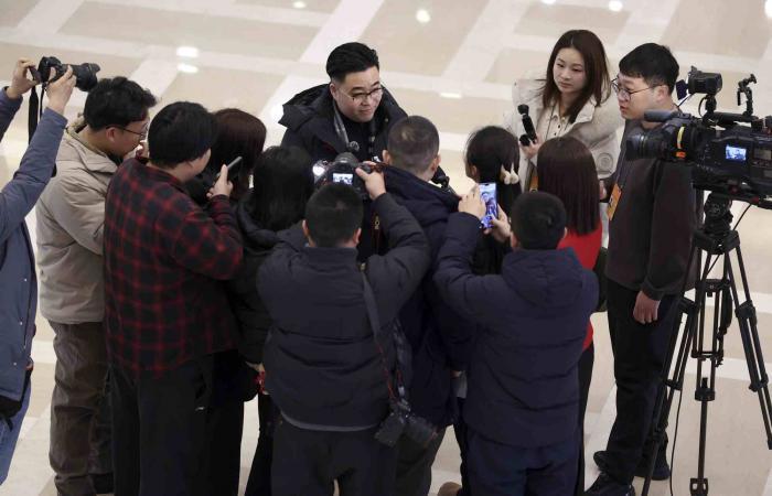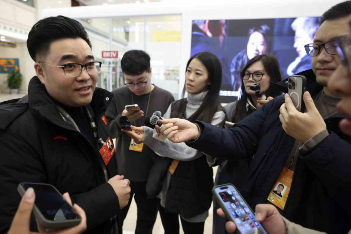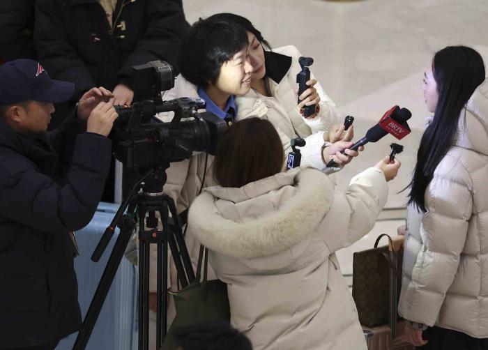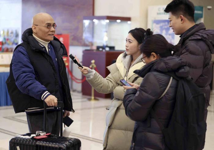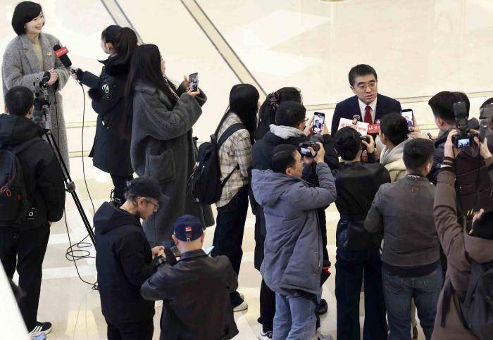前来报到的人大代表接受记者们的采访。