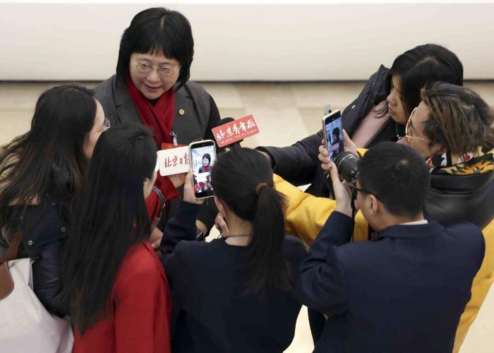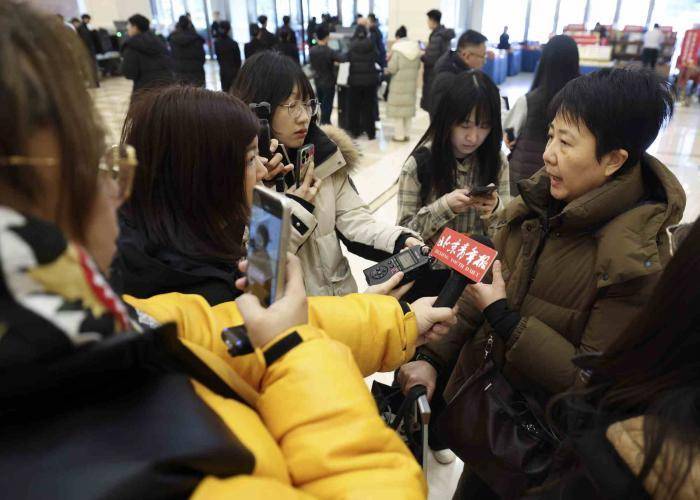 人大代表接受北京青年报记者的采访。