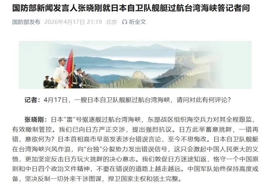 记者:4月17日,一艘日本自卫队舰艇过航台湾海峡,请问对此有何评论?